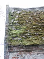 Die Deckung des Kirchendachs ist defekt und vermoost. Durch die Löcher in der Dachdeckung dringen Niederschläge ein und