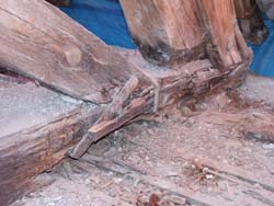 - Nachdem Teile des Holzfußbodens aufgenommen wurden, zeigte sich, dass über die Hälfte alle Deckenbalken so kaputt sind, dass sie erneuert werden